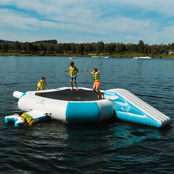 Pirate Base è un trampolino gonfiabile che si gonfia e posiziona in acqua in poco tempo, consente ai vostri clienti divertimento e relax per tutte le età, ed è adatto sia per saltare e scivolare o semplicemente come comoda piattaforma galleggiante per rilassarsi. Disponibile anche in versione aquapark con scivolo e asse di equilibrio.